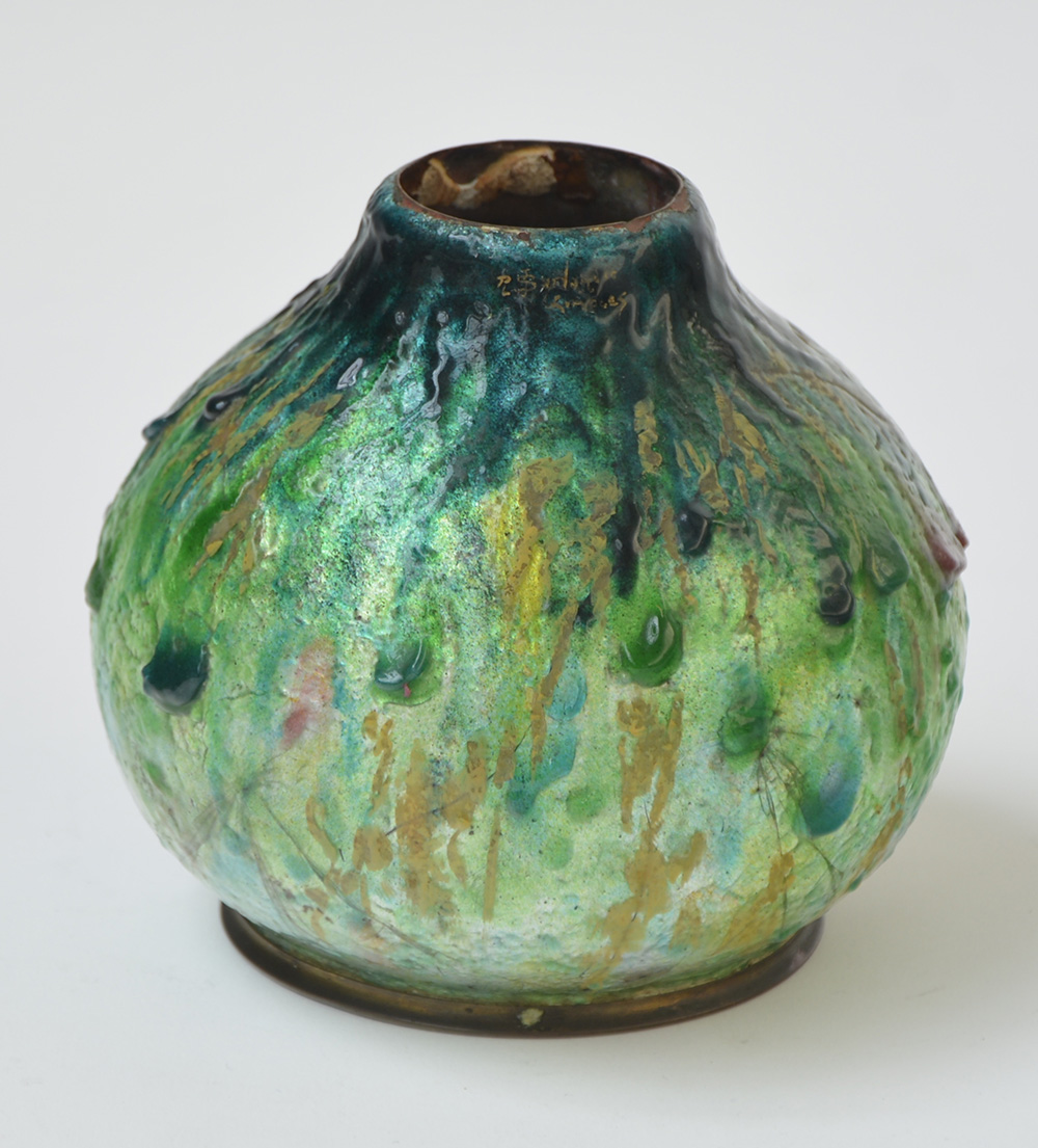 Vasetto bulbiforme in rame smaltato a colature policrome. Limoges, 1920. Firmato in oro in prossimità del bordo. (lievi difetti)