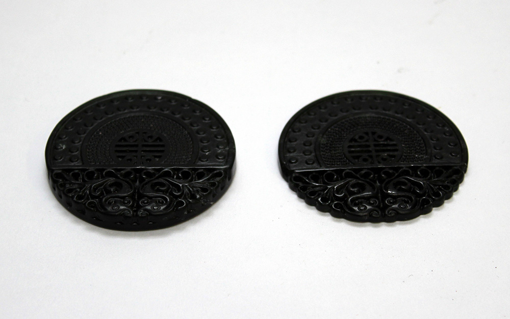 Lotto 2321 | Due placche in pietra dura scolpite a motivi arcaici (d cm 5) (difetti)