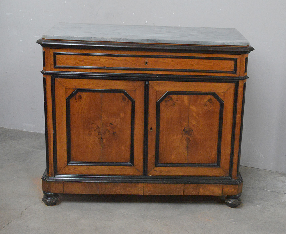 Comò lombardo con filettature ebanizzate, grande cassetto nella fascia e due battenti celanti cassetti. Piano in marmo grigio. Fine secolo XIX (cm 118x100x57) (difetti)