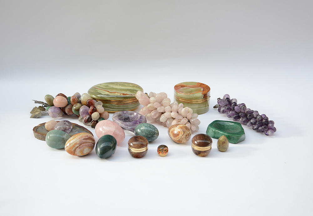 Lotto composto da tre grappoli d'uva, tre posa cenere, sette uova e cinque scatole con coperchio in pietra dura (difetti)