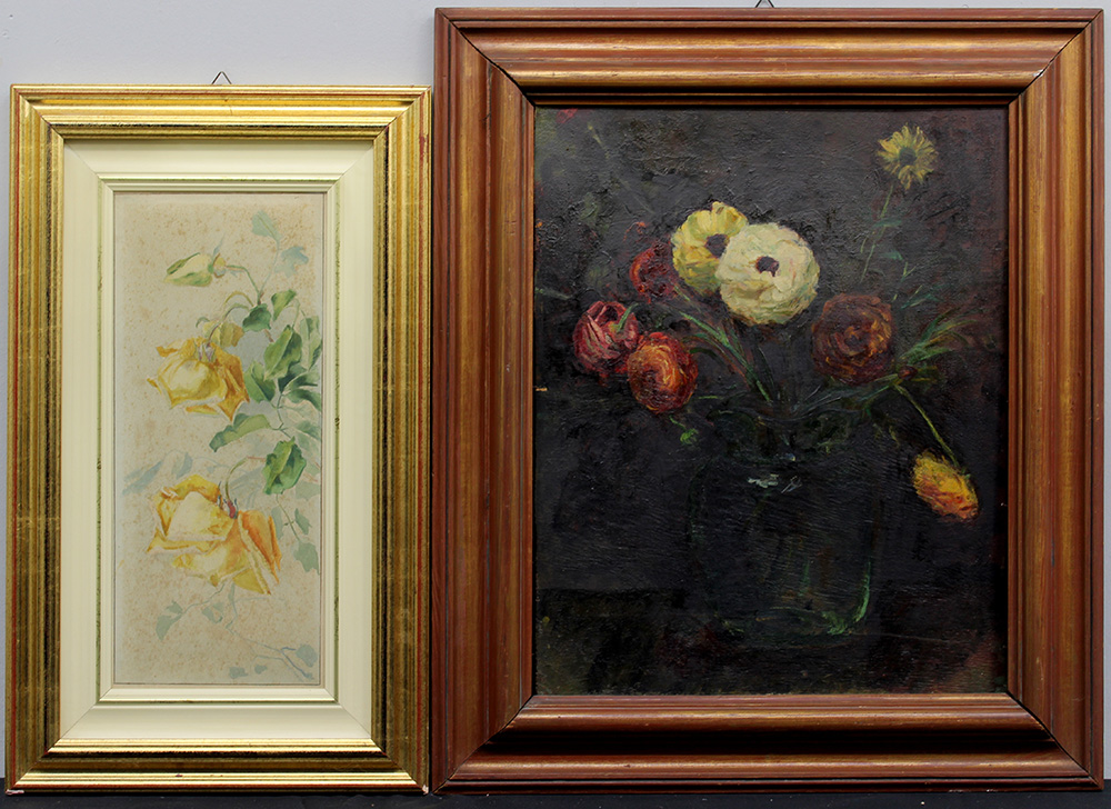 Lotto composto da un acquerello raffigurante rose ed un olio con vaso di fiori, autori e misure differenti, in cornici (difetti)