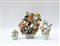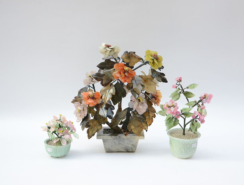 Lotto di tre portafiori in porcellana monocroma con piantine ornamentali con foglie e fiori in pietra dure (h max cm 30,5) (difetti)