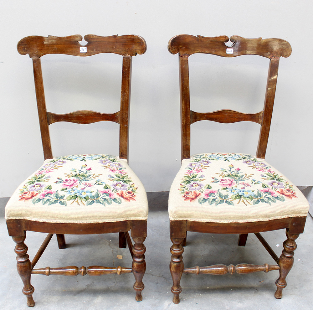 Coppia di sedie in noce con schienale a cartella sagomate e sedute ricamate a mezzo punto a motivi floreali, secolo XIX (difetti)