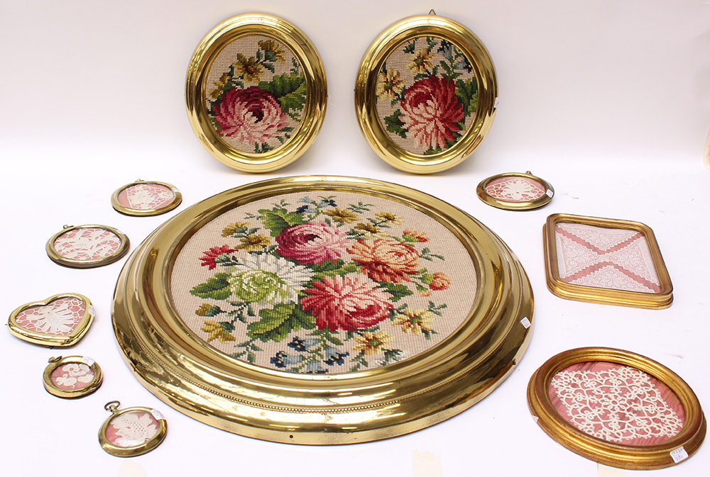 Lotto composto da tre cornici ovali in ottone contenenti ricami a fiori e otto più piccole contenenti centrini