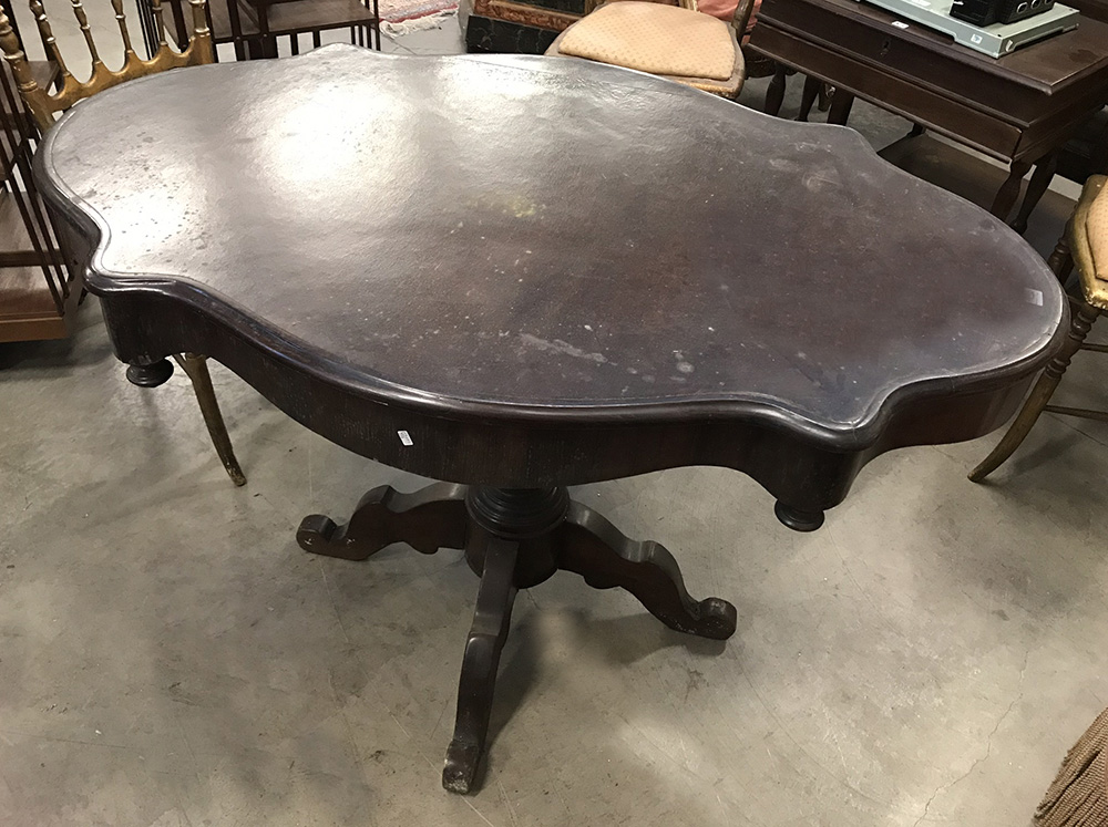 Tavolo a biscotto con piano sagomato e gamba centrale tornita terminante a...