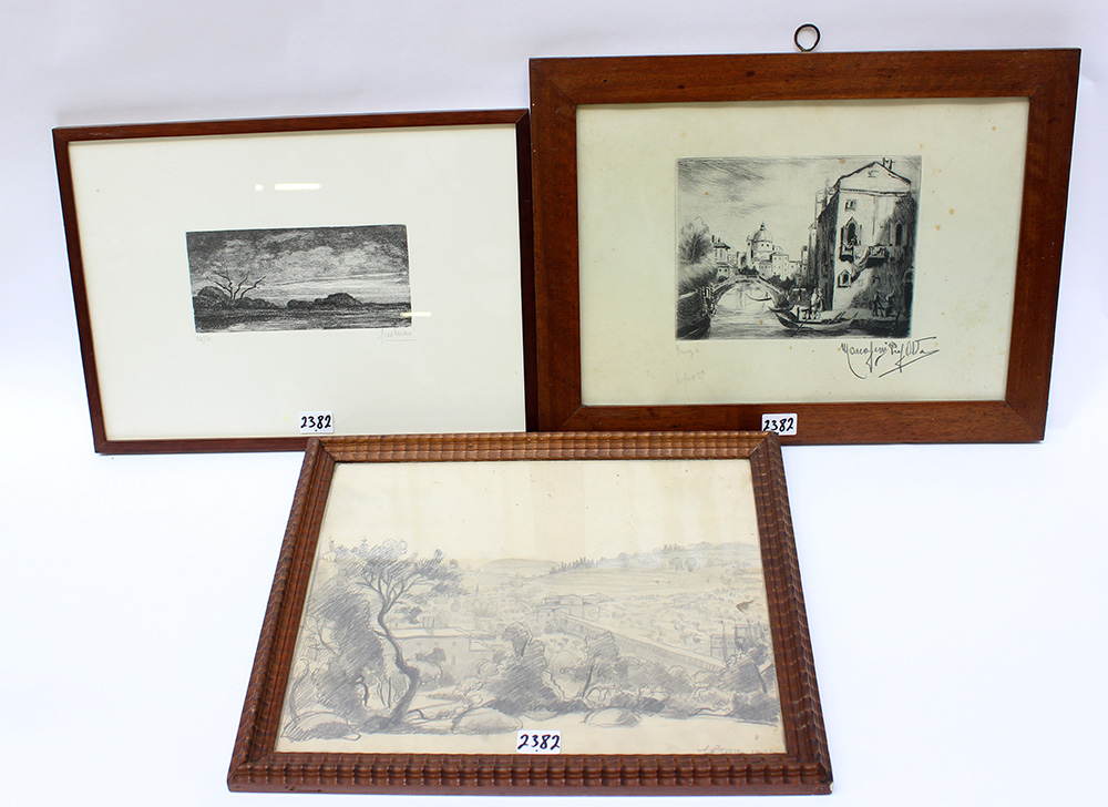 Lotto 2382 | Lotto composto da un disegno e due acquaforti firmate, in cornici (difetti)