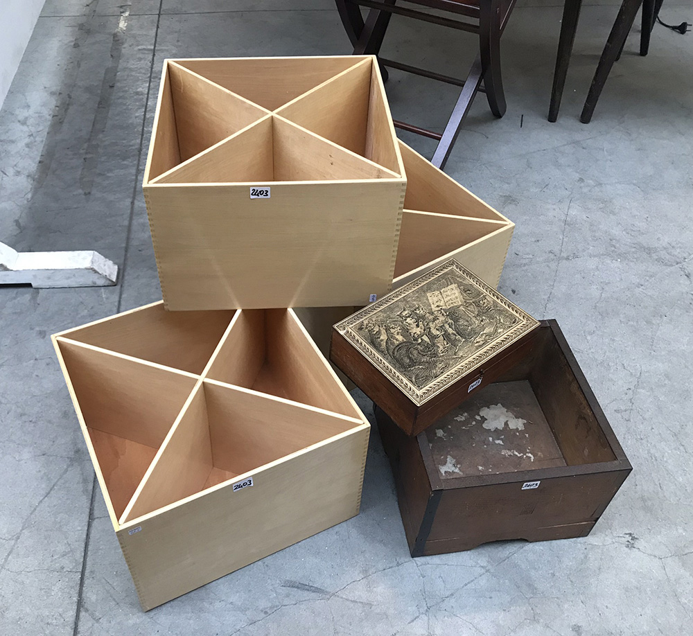 Lotto composto da due scatole in legno di cui una orientale e tre contenitori modulari in legno a quattro scomparti (difetti)
