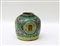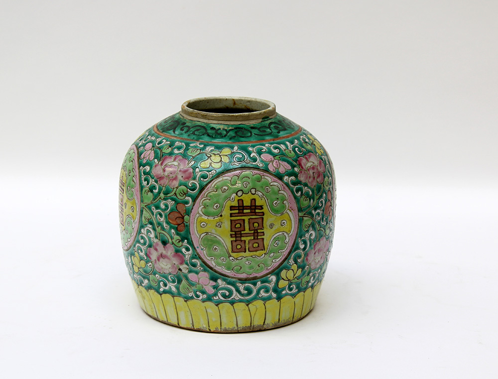 Vaso in ceramica Famiglia Rosa su fondo verde e motivo beneaugurante del "doppio xi" (h cm 22) (difetti)