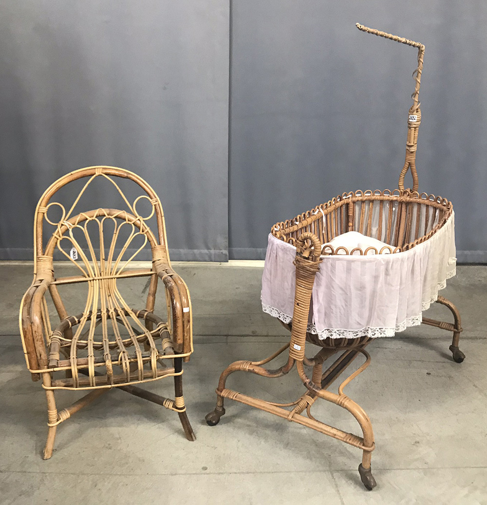 Lotto composto da una culla e una sedia da bambino in vimini (difetti)
