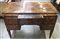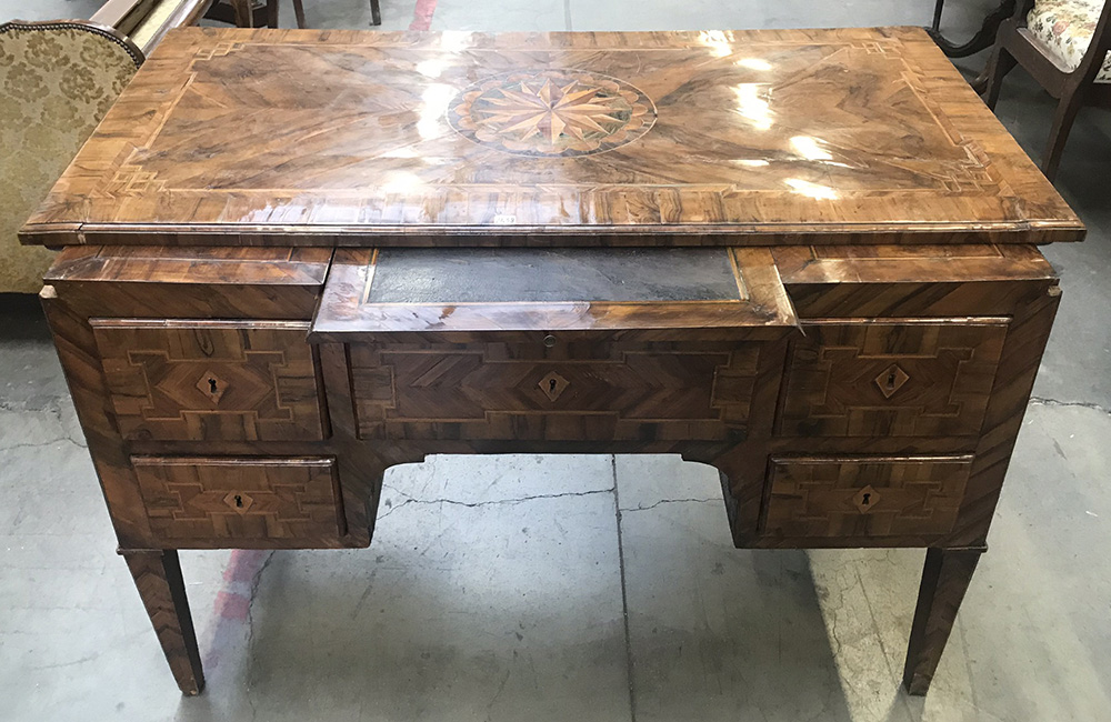 Scrivania da centro lastronata in noce e radica di noce, filettata e intarsiata sul piano con rosone. Pianetto estraibile e cinque cassetti sottopiano e gambe rastremate, fine secolo XVIII (cm 134x87x70) (difetti e restauri)