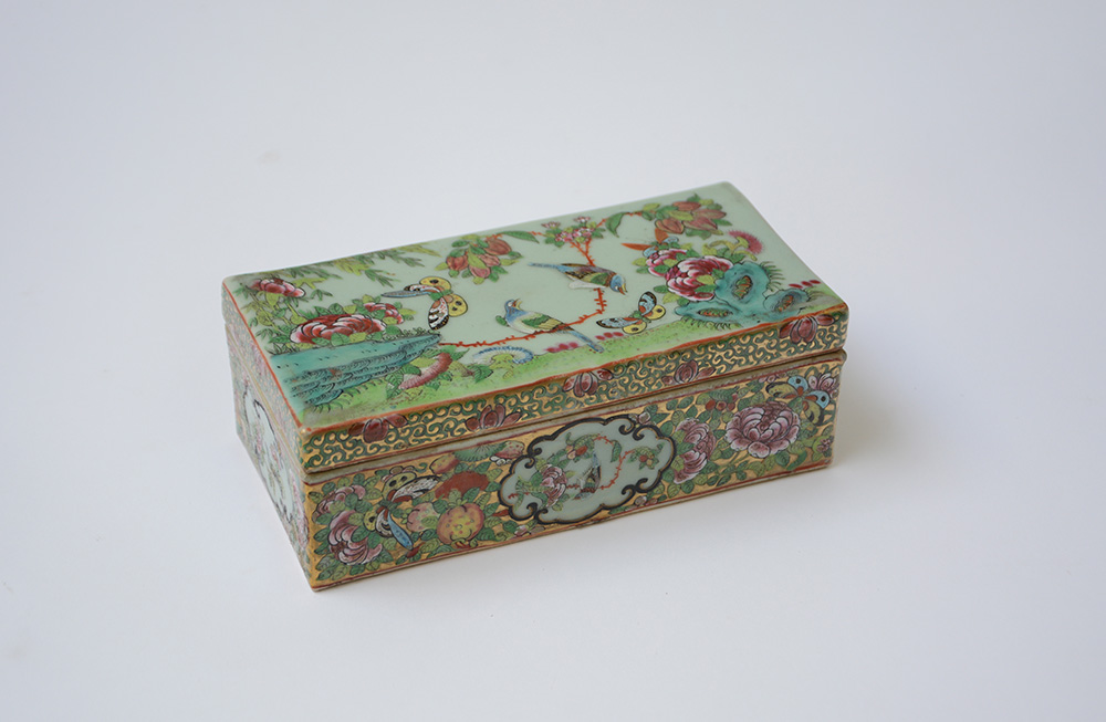 Scatola rettangolare in porcellana Famiglia Rosa Cantonese su fondo celadon decorata con volatili e farfalle tra fiori (l. cm 19) (lievi difetti)