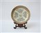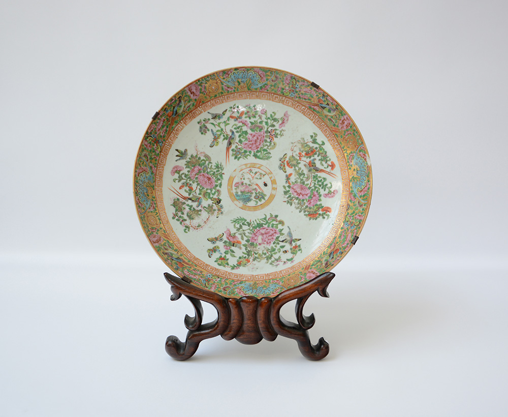 Grande piatto Famiglia Rosa Cantonese su fondo dorato decorato con farfalle e volatili tra rami in fiore, supporto in legno (d. cm 36,5) (difetti)