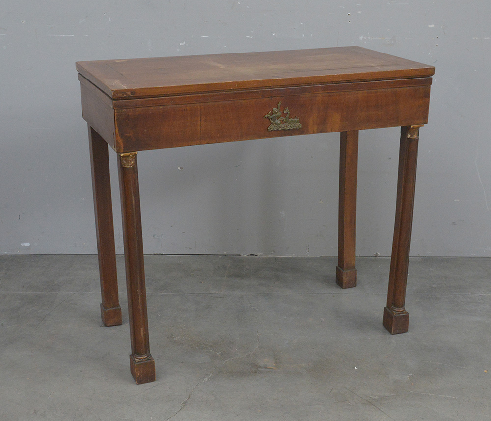 Tavolo da lavoro in stile impero con piano apribile celante vani. Gambe...