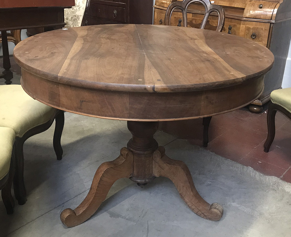 Tavolo con piano di forma circolare, gamba centrale sagomata terminante a tre piedi mossi (d. cm 100 x h. cm 76) (difetti)