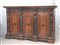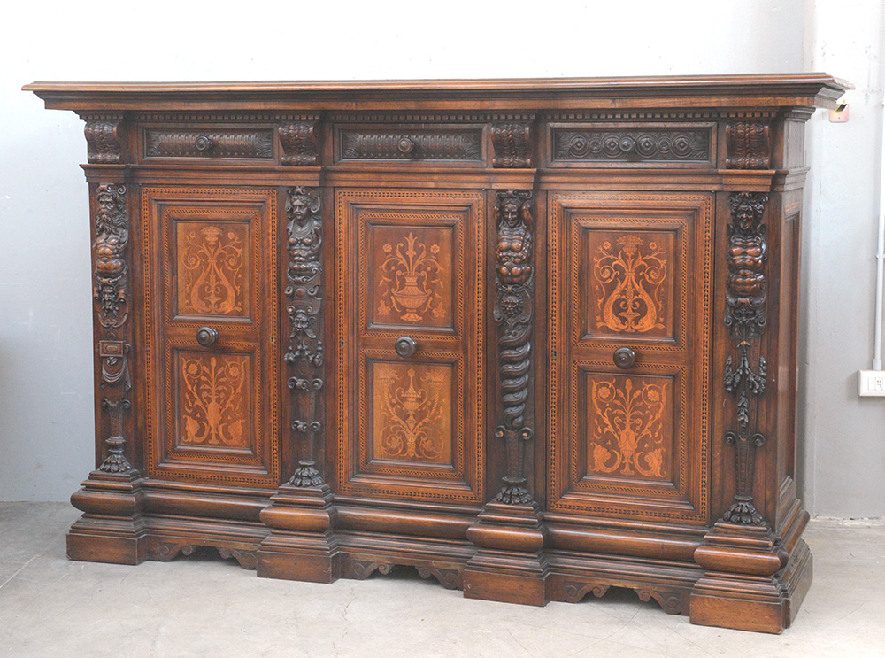 Credenza a tre cassetti e tre ante intarsiati a vasi fioriti e volute, montanti scolpiti ad erme con ghirlande floreali (cm 250x153x58)
