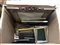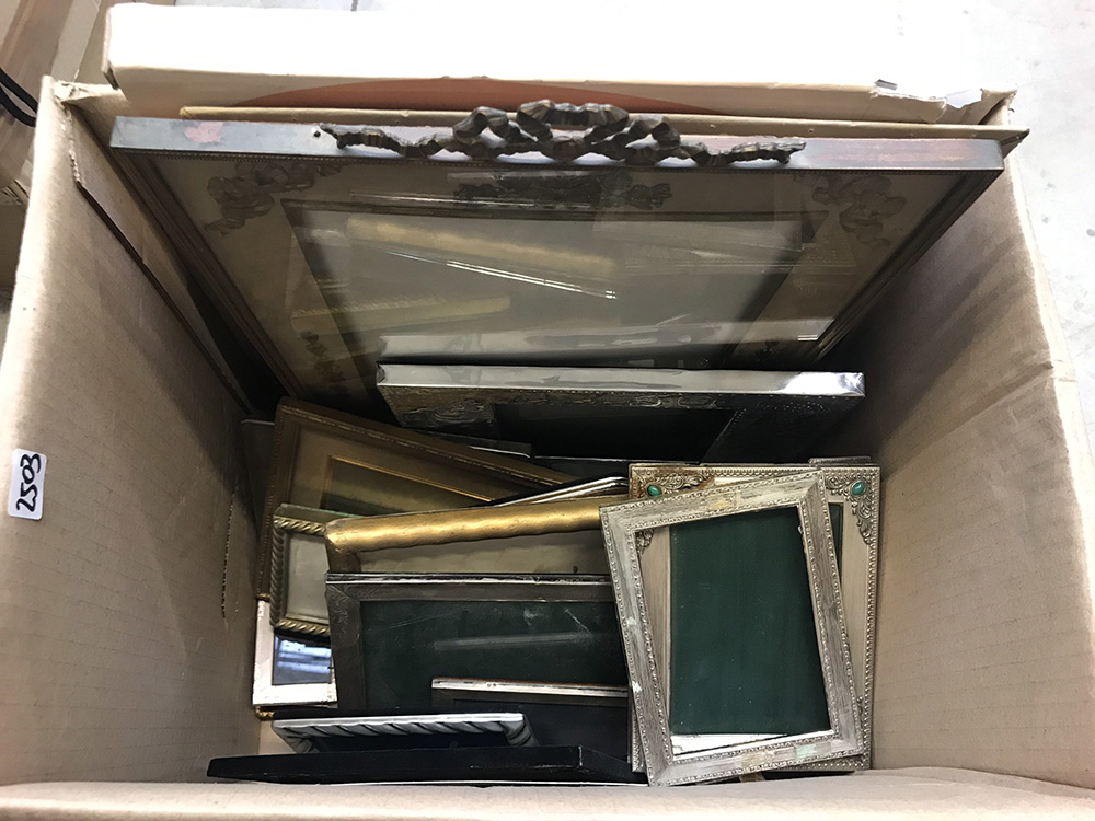 Cartone contenente numerose cornici portafoto in argento, legno e metallo argentato (difetti)