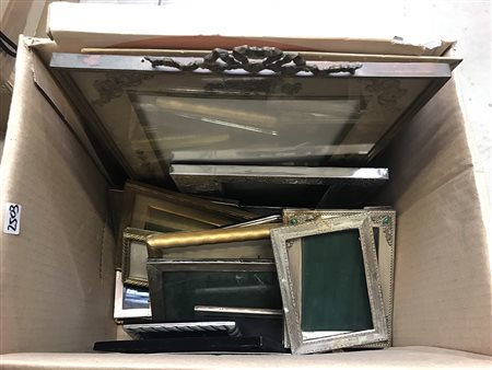 Cartone contenente numerose cornici portafoto in argento, legno e metallo...