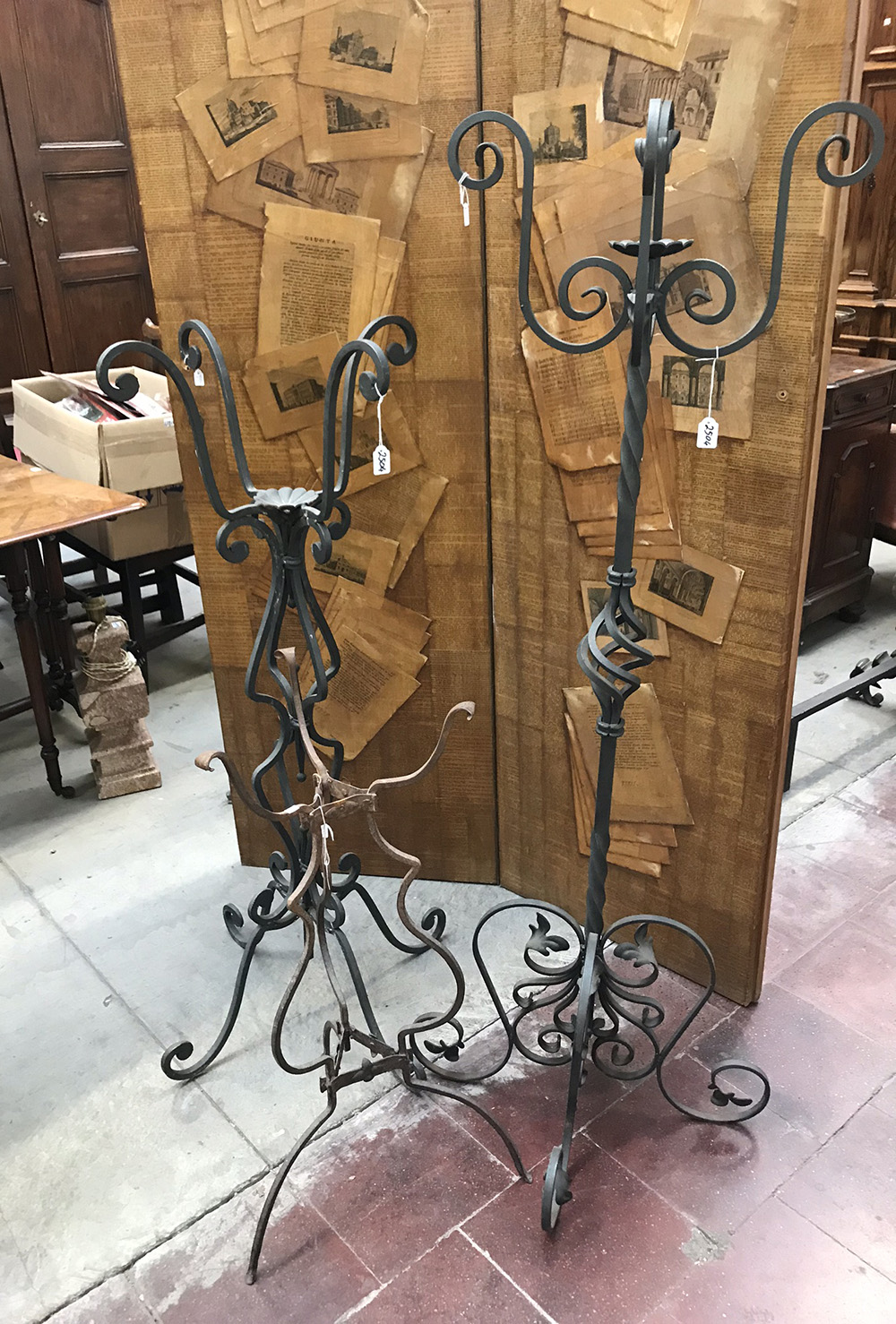 Lotto di tre trespoli in ferro battuto (h max cm 140) (difetti)