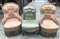 Lotto di tre poltroncine da camera, due con gambe tornite e una con gambe mosse, rivestimento in tessuto rosa e color salvia (difetti)