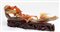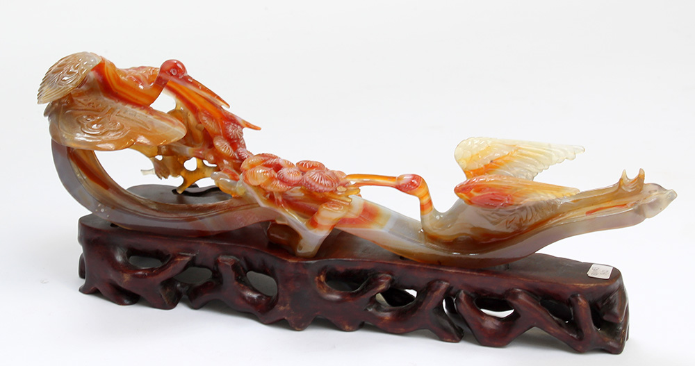 Scettro ruyi in agata corniola scolpito con gru e rami di pino, con base in legno (l. cm 30) (lievi difetti)