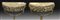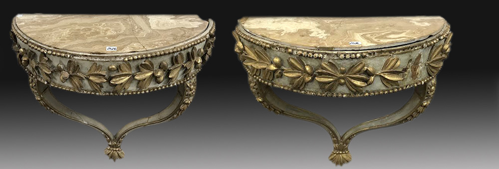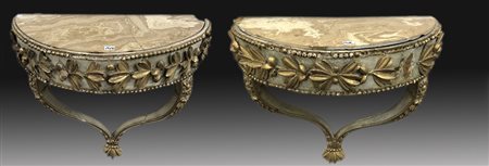 Coppia di piccole consolles a goccia in legno laccato e dorato. Fascia a...