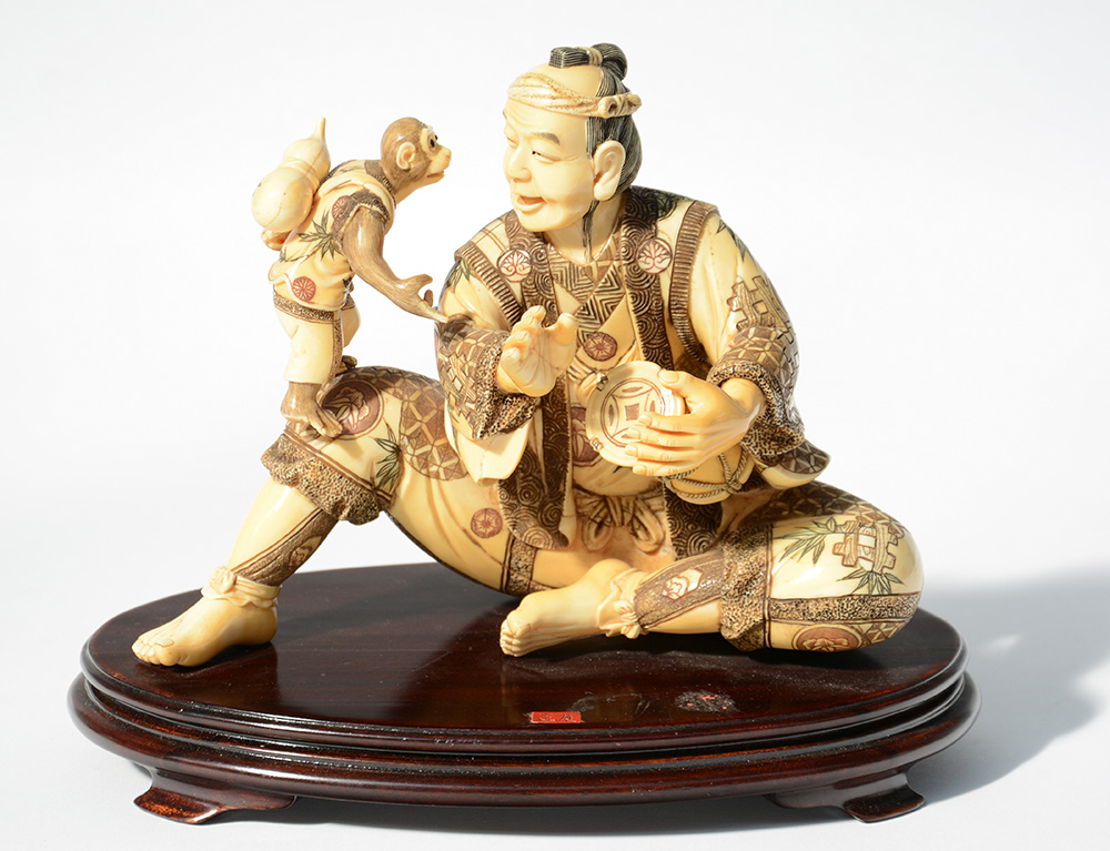Okimono raffigurante addestratore di scimmie, base in legno con firma (h. 18...