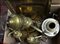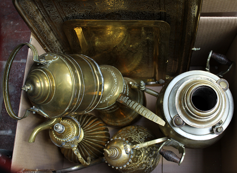 Cartone contenente un samovar, quattro versatoi e due vassoi in ottone (difetti)
