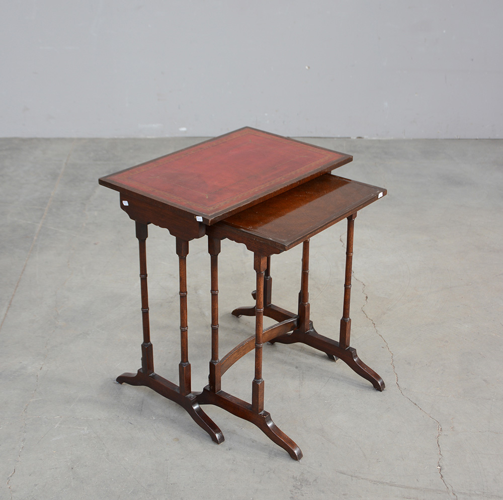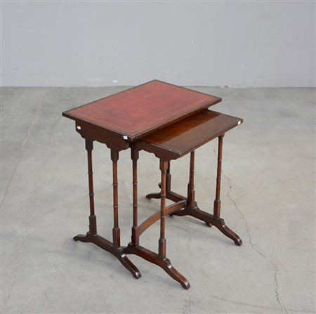 Lotto di due tavolini a nido rettangolari con gambe tornite e piedi sagomati...