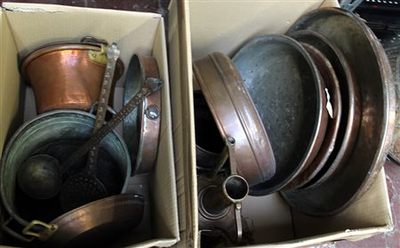 Lotto di due cartoni contenenti numerosi oggetti in rame (difetti)