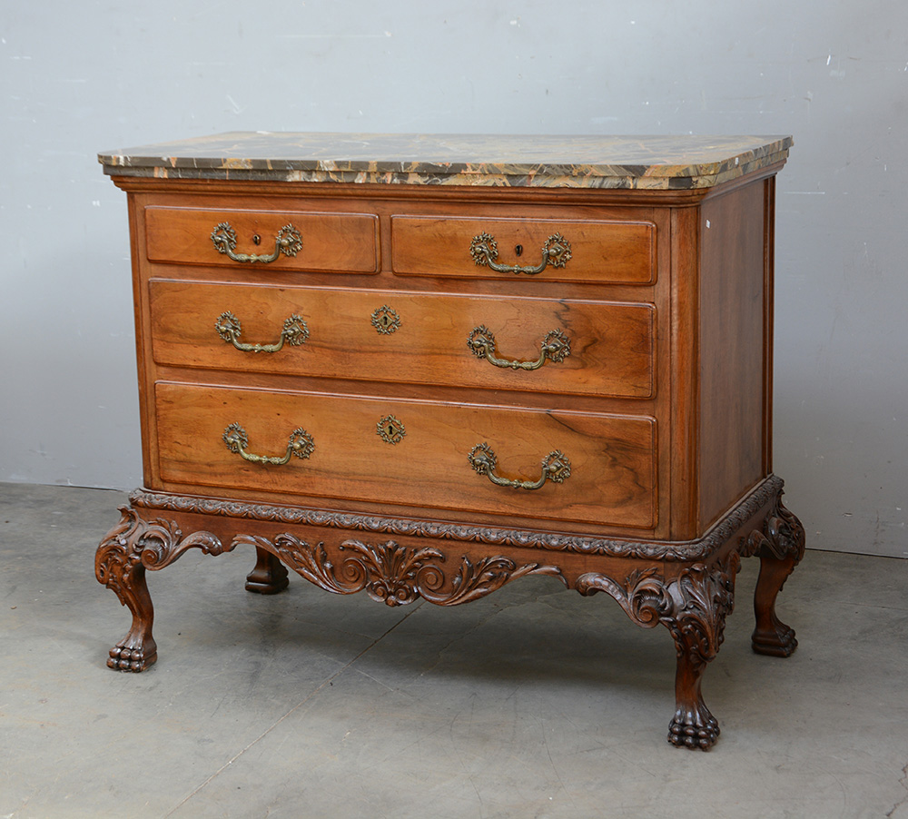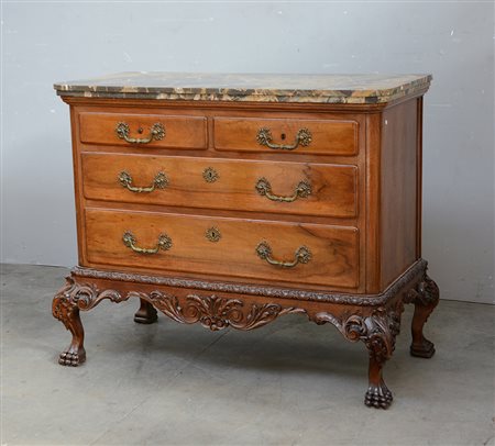 Comò di forma mossa in mogano a due cassetti piccoli sottopiano e due grandi sul fronte, fascia riccamente intagliata a motivi vegetali e volute, piedi a zampa ferina. Piano in marmo. Inghilterra inizio sec. XX (cm 115x95x53)