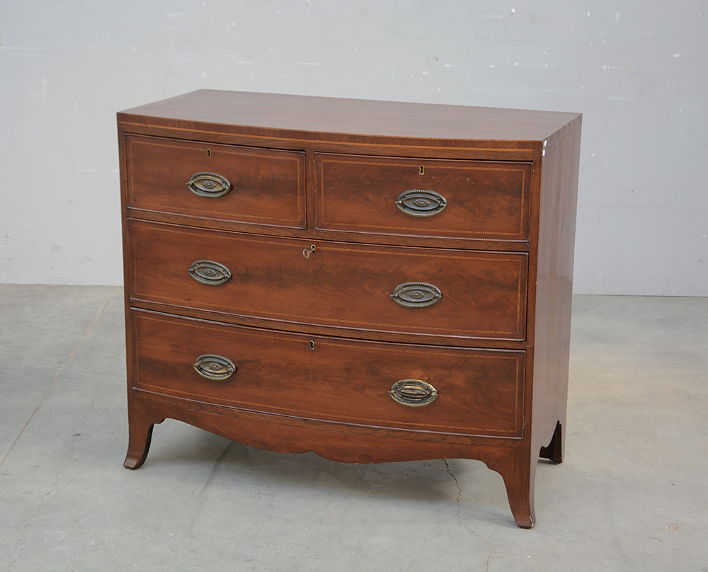 Comò di forma mossa in mogano filettato in legno chiaro a due cassetti piccoli sottopiano e due grandi sul fronte, fascia e gambe sagomate. Inghilterra fine sec. XIX (cm 101x86x49)