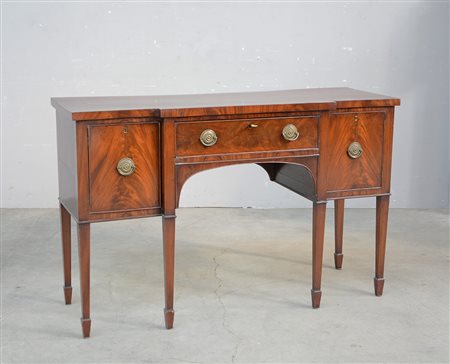 Sideboard in mogano e piuma di mogano ad un cassetto sottopiano e dua antine laterali. Gambe rastremate. Inghilterra fine sec. XIX (cm 145x92x52)(difetti)