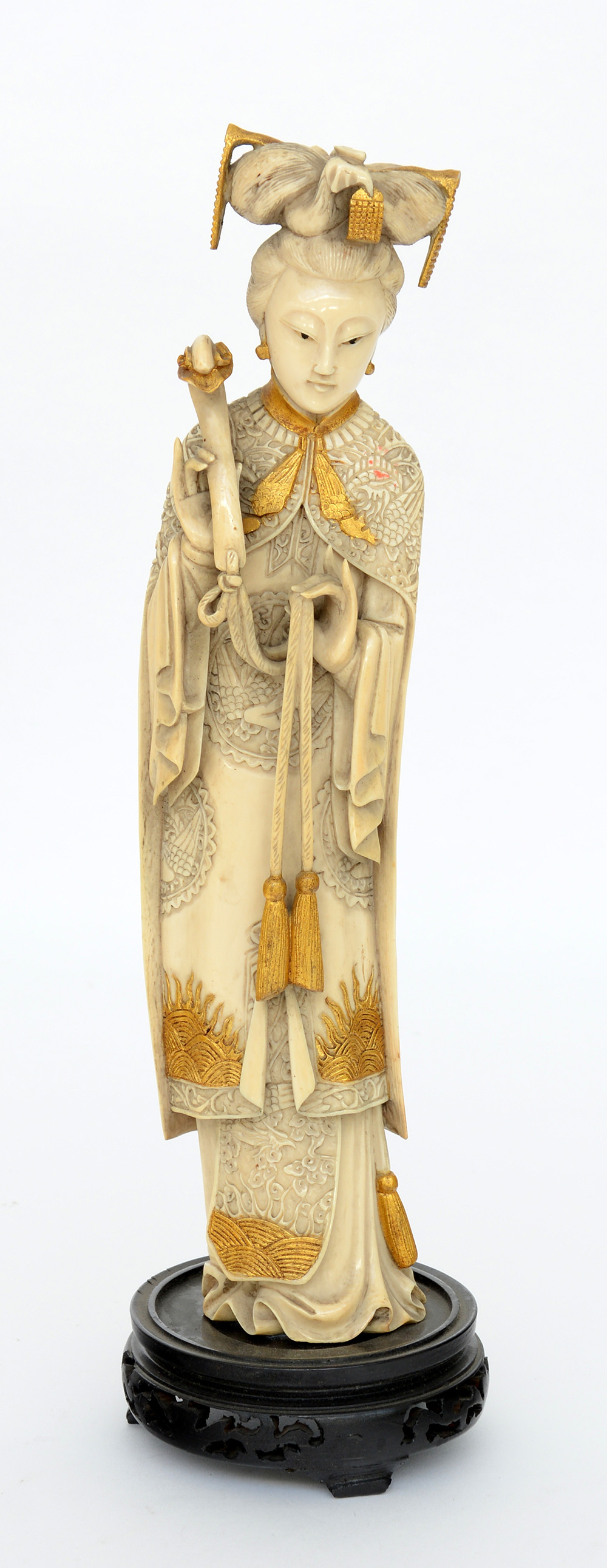 Imperatrice in avorio con dettagli dorati con base in legno (h. 35 cm.)(difetti)