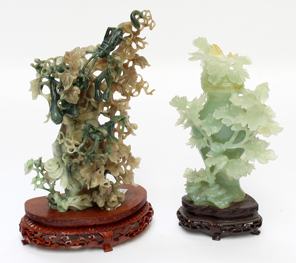 Due vasi in pietra dura scolpiti con motivi floreali e insetti, base in legno (difetti e mancanze)