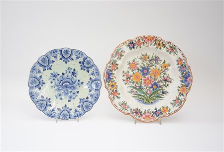 Lotto composto da due piatti tondi in ceramica policroma di fatture e decori...