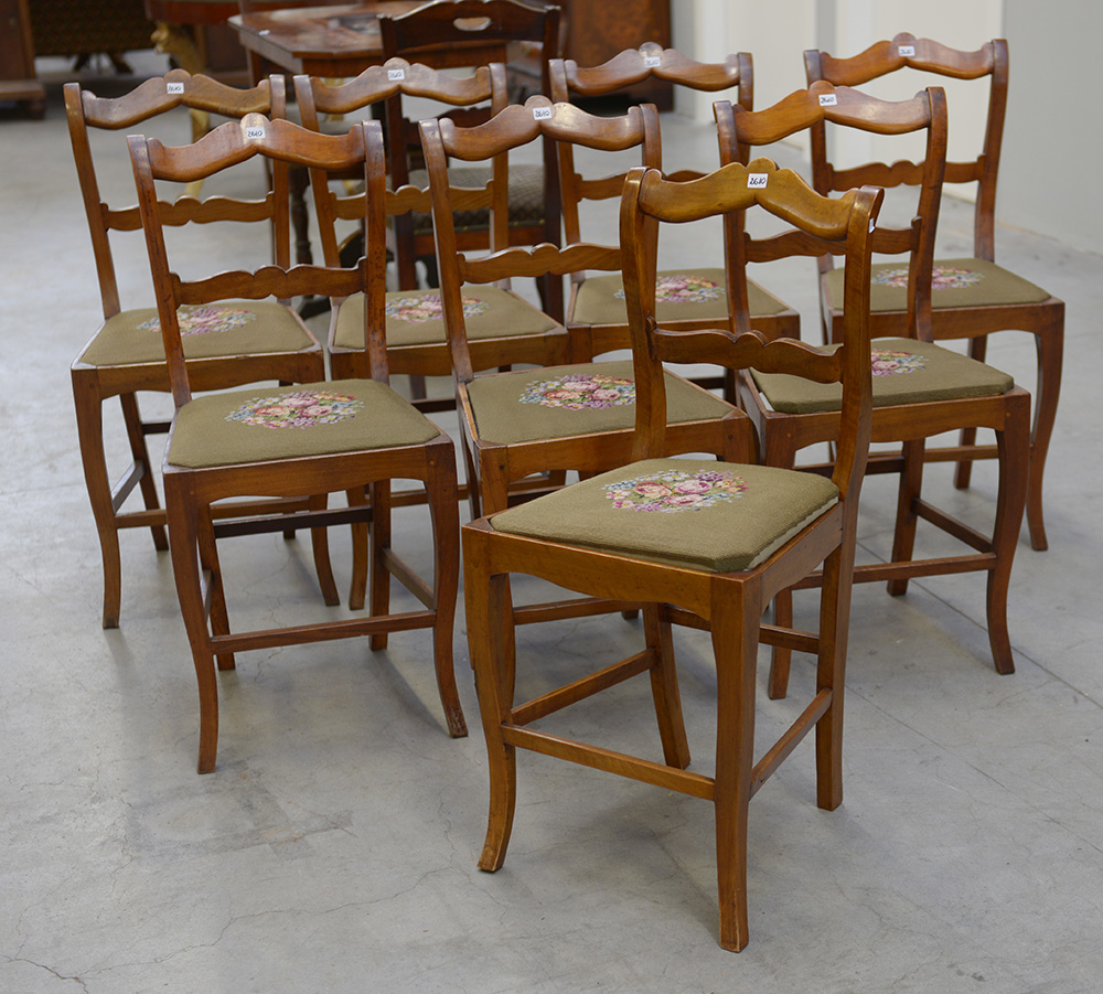 Gruppo di otto sedie in noce con schienale a cartelle sagomate, gambe mosse riunite da traverse dritte e seduta