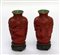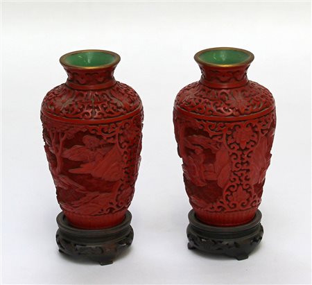 Due vasetti color cinabro incisi con figure e scene di paesaggio, base in legno (h cm 13) (difetti)