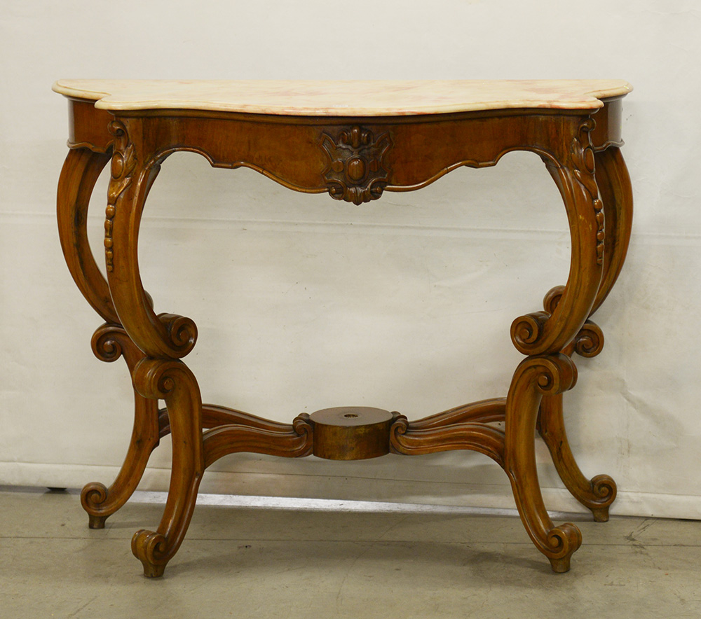 Console in noce Luigi Filippo con fascia, montanti e traverse sagomate intagliate a stemma e motivi vegetali. Piano in marmo rosa, Fine secolo XIX, piano di epoca posteriore (cm 116x93x53) (difetti)