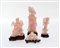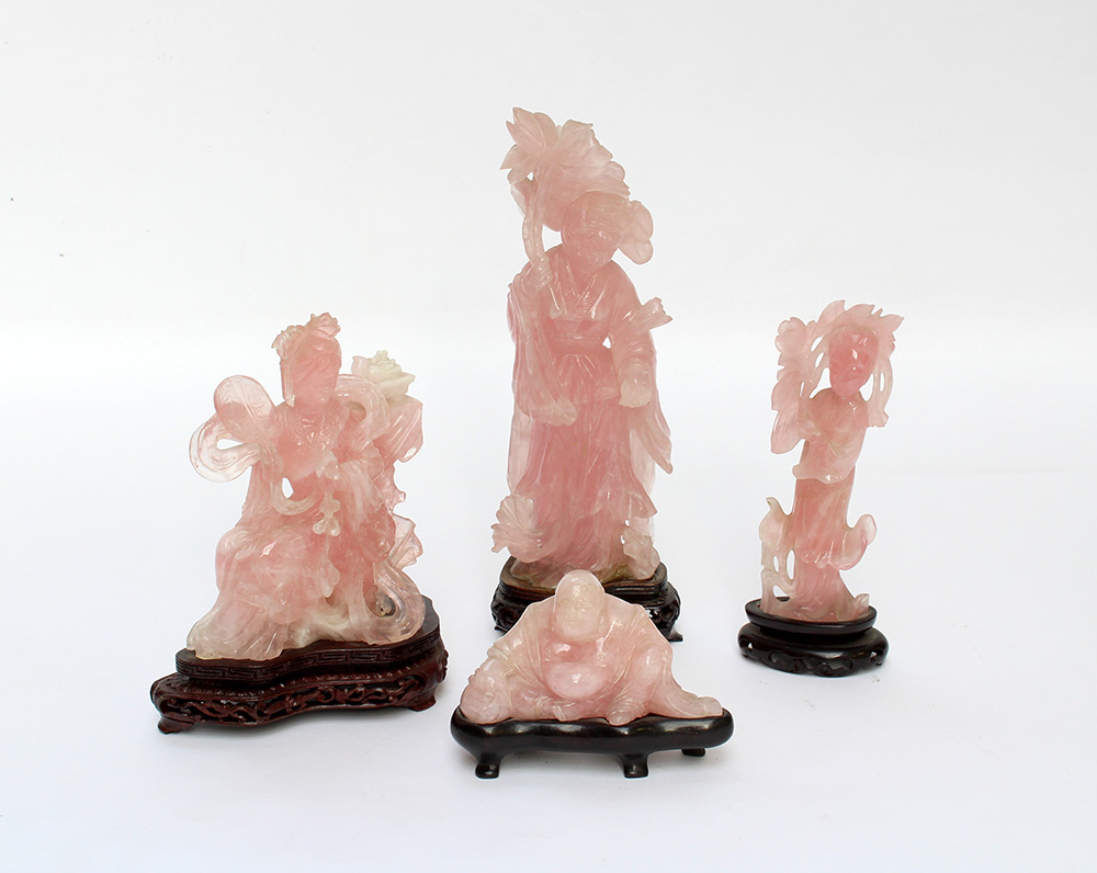 Gruppo di quattro sculture in quarzo rosa raffiguranti dame dalle lunghe vesti e un Buddha (h max cm 23)(difetti)