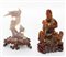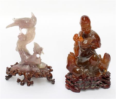 Due sculture in pietra dura, una raffigurante monaco, l'altra volatili su ramo con base in legno lavorato (h max 16,5) (lievi difetti)