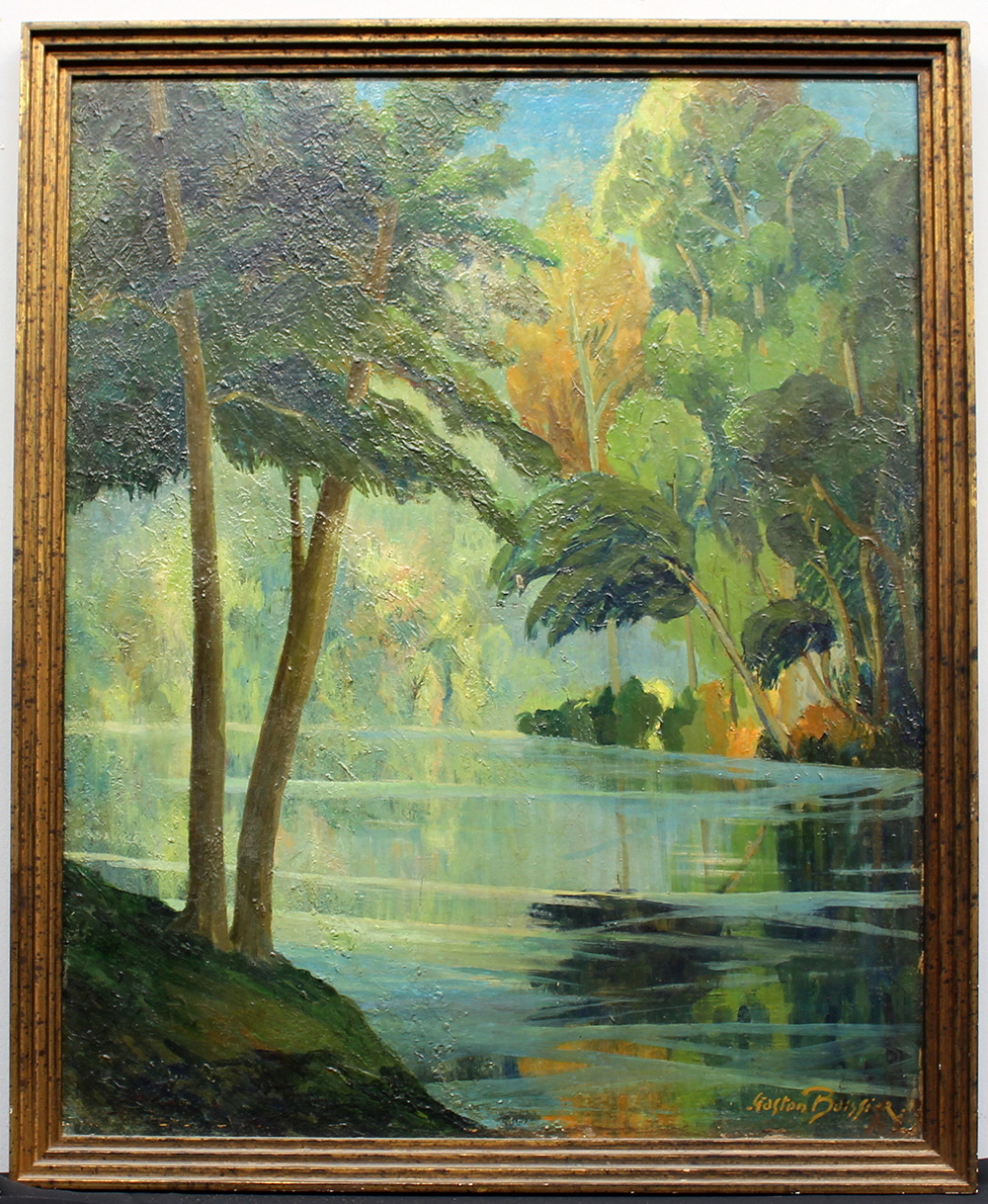 Ignoto "Paesaggio lacustre" olio su compensato (cm 80x65) Firmato Gaston Boissier in basso a destra. In cornice (difetti e restauri)