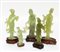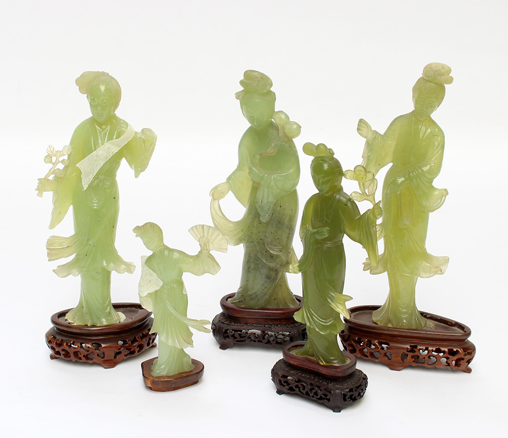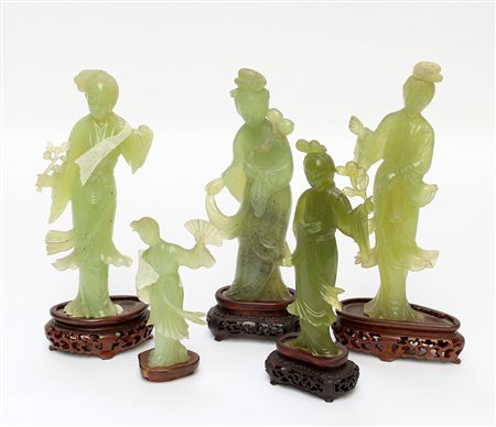 Cinque sculture in pietra dura color verde chiaro raffiguranti dame dalle lunghe vesti con basi in legno (gravi difetti, mancanze e rotture)