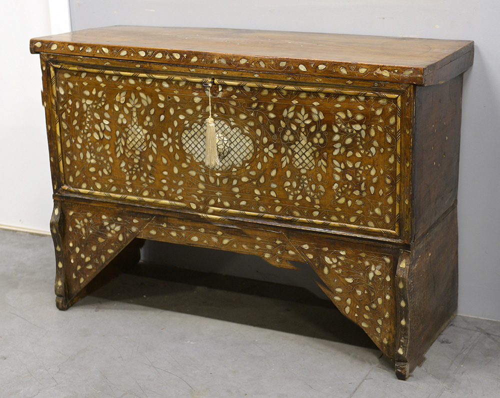 Madia in cedro del Libano intarsiata in madreperla a motivi vegetali e fiori (cm 120x85x48) (difetti)