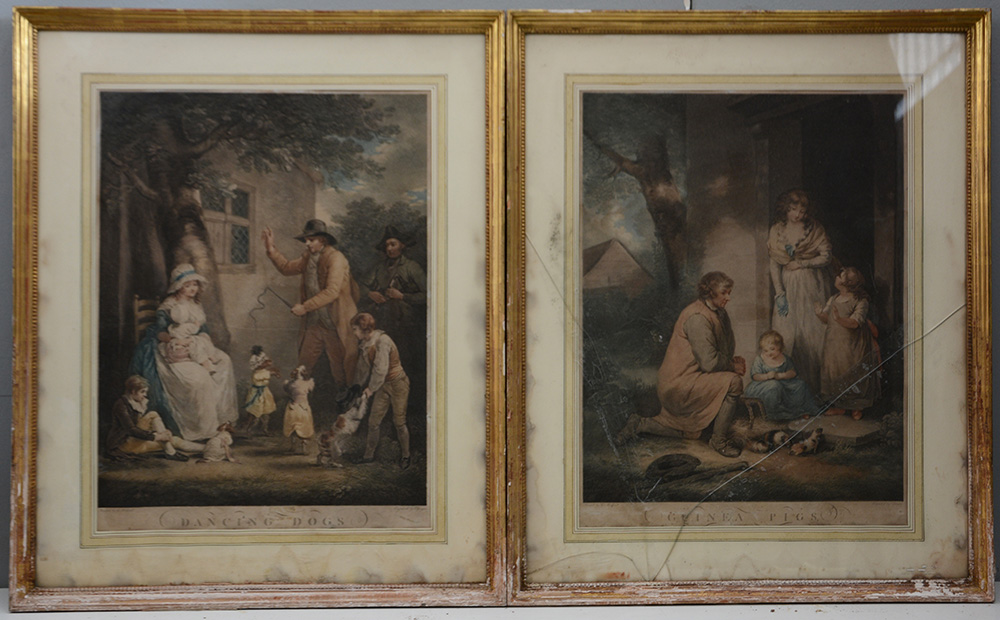 Coppia di litografie inglesi a cvolori raffiguranti scene di vita in cornici (difetti)