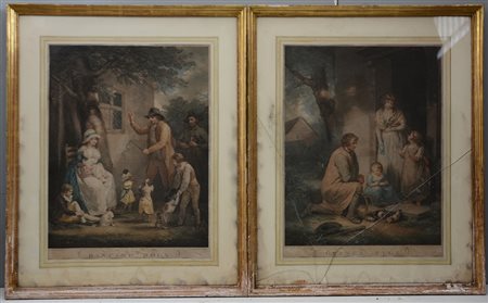 Coppia di litografie inglesi a cvolori raffiguranti scene di vita in cornici...