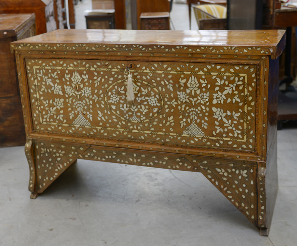 Madia in cedro del Libano intarsiata in madreperla a motivi vegetali e fiori (cm 136x90x53) (difetti)