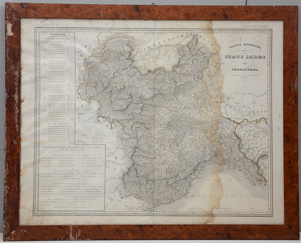 Carta moderna degli Stati Sardi di Terraferma, in cornice (gravi difetti)