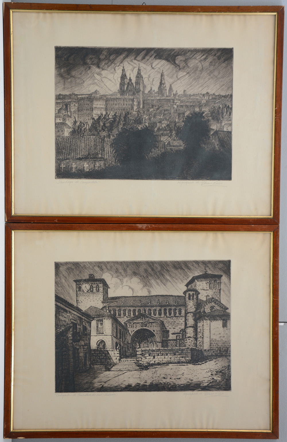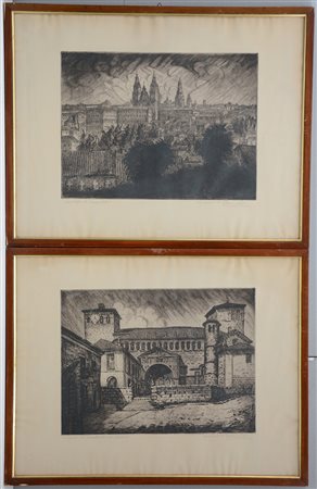 Coppia di litografie raffiguranti scorci di palazzi, in cornici