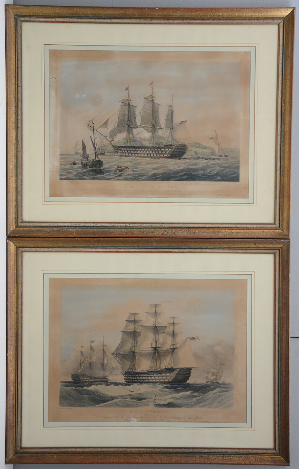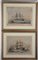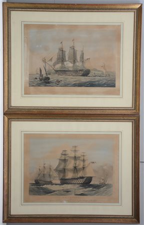 Coppia di litografie a colori raffiguranti vascelli, in cornici (difetti)