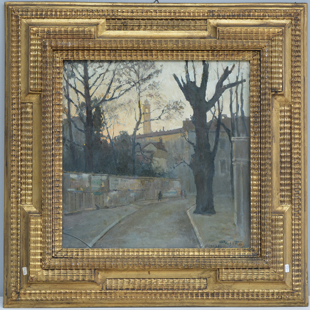 "Milano via Mozart" 1930, olio su compensato (cm 40x40) Firmato in basso a destra. Al retro: iscritto e titolato. In cornice
